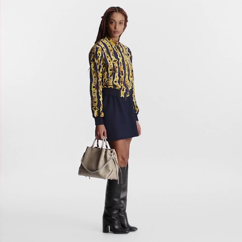 The Bella Tote bag is made from supple Mahina calf leather in a subtle and elegant Galet grey. The leather is delicately pleated and draped, as well as adorned with a jewel-like chain. The Bella Tote blends the design of the classic bucket bag with the carryall tote, making this stylish bag perfect for everyday use.