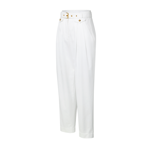 These elegant trousers from the Nautical Collection are crafted from breezy cotton twill in a high-rise shape that tapers towards the ankles. Gold-colour hardware adds a chic polished touch to the two flap pockets on the hips and the removable belt, while a tone-on-tone leather LV Circle patch subtly signs the back pocket.