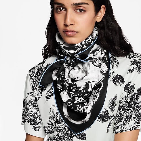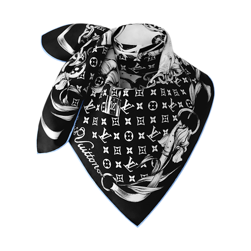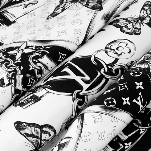 Inspired by the romantic spirit of floral tattoos, the Blooming Monogram square features a bold yet refined design printed on sumptuous silk. Delicate images of flowers and butterflies surround a large Monogram Flower, mixed with trunk-style straps, padlocks and luggage tags that recall the House’s travel heritage. The Monogram pattern and LV Initials add an extra signature touch.