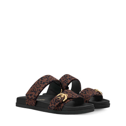 The Bom Dia Comfort Mules are revisited in Monogram Leopard print canvas, a key motif of the season. This model is notable for its two adjustable straps: one fastens with a gold-colour buckle, the other, which bears the LV Initials signature, with velcro. It is finished with a comfortable anatomic footbed and a supple rubber outsole.