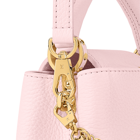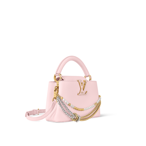 The Why Knot Collection reinvents the Capucines Mini bag in a Sweet Pink colourway, adding a feminine touch to any accessories collection. It is crafted from refined Taurillon leather adorned with a bi-galvanised decorative chain that is inspired by jewellery. The elegant embellishment features signature Monogram hanging charms with exquisite pearl details. This edition also comes with a longer strap for versatile styling.