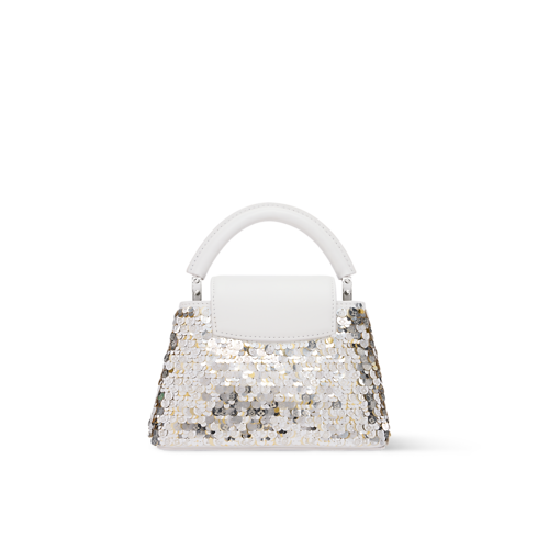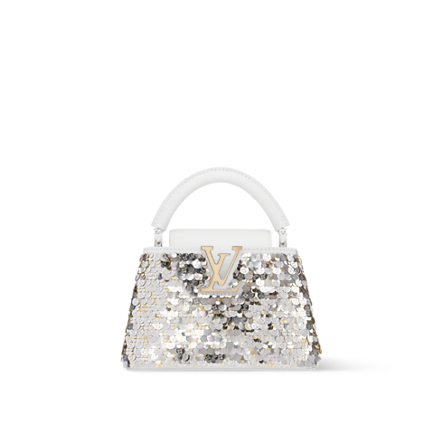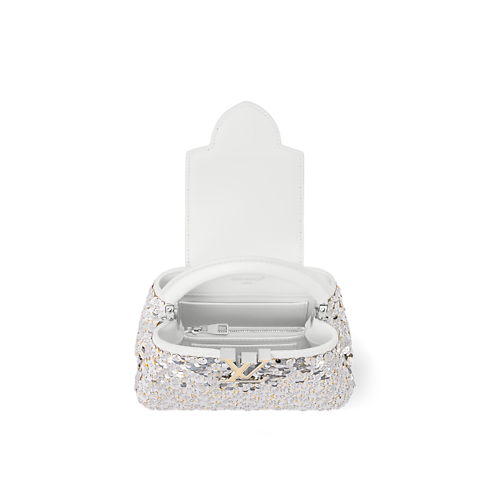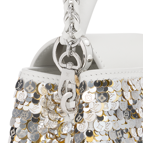 Reimagined in an elegant snow colourway, this Capucines Mini bag belongs to the Exceptionals Collection. It is crafted from calfskin embroidered with shimmering sequins and features gold- and silver-coloured LV Initials to match the braided chain. Inside, it is fitted with a flat pocket and has enough space to store daily essentials, including a favourite lipstick.