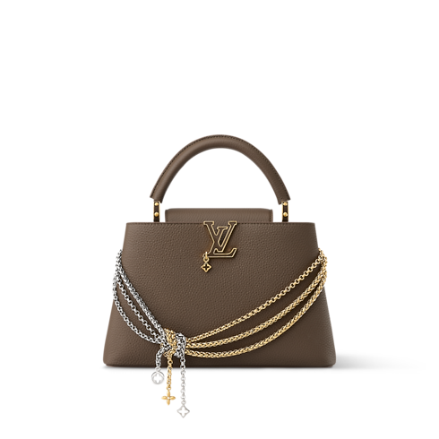 The Capucines MM bag has been reimagined for the Why Knot Collection in a versatile dark clay colourway that complements most looks. Crafted from Taurillon leather, it has a mixed-metal chain adorned with Monogram Flower charms, which match the mini charm attached to the signature LV Initials. The elegant design comes with a removable strap for shoulder or cross-body carry.
