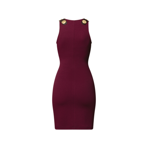 This dress makes a sleek statement in a form-fitting clothing silhouette cut from a lightweight viscose-blend crepe jersey in a rich seasonal shade. The front is highlighted with an exposed double-ended zip running from the scoop neckline to the hem, while chunky gold-colour carabiner buckles add a rebellious detail to the shoulders.
