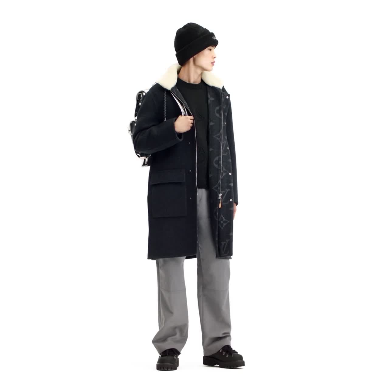 This luxurious and effortless coat is perfect for chic winter holidays. The deep grey silhouette is crafted from fluid double-face fabric in a sumptuous wool, cashmere and silk-blend, adorned with a jacquard Macro Monogram motif on the inside. An adjustable hood and a tall, shearling-lined collar provide extra warmth, while elegant accents include a woven Damier drawcord and an LV ornament at the top of the placket.