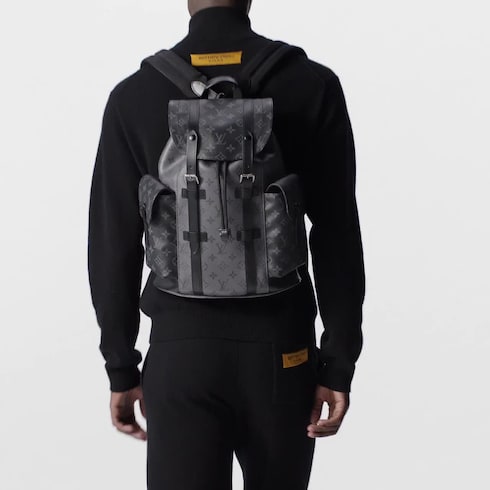 The Christopher PM backpack takes on a striking aspect in Monogram Eclipse Reverse canvas with a black leather trim. Two side pockets enable quick access to essentials while the leather flap with press stud closure keep belongings safe. The Christopher PM is inspired by the design of the rugged hiking rucksack, rendered here in smaller dimensions.