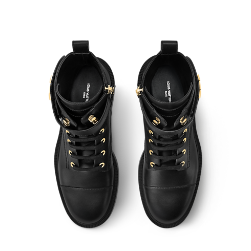 The Citizen Flat Ranger Boots combine uppers in smooth calf leather with hardware in gold-colour metal. The military styling of these ankle boots is balanced by refined details, including adjustable and removable straps with partially leather-covered LV Initials signatures. In addition to laces, this model has side zips for easy fitting.