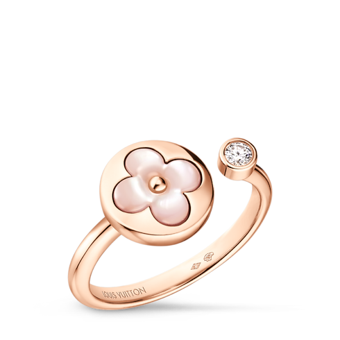 The Color Blossom pieces celebrate the emblematic Monogram Flower, designed in 1896 by Georges Louis Vuitton, son of the founder. Set into 18-karat pink gold, this precious ring features a sun motif carved from pink mother-of-pearl, hand-polished to a high gloss and accented by a brilliant round diamond. Months of work were necessary to perfect the stone’s subtle curves and sparkle. This delicate ring is an invitation to stack, mix or match with other models from the collection.