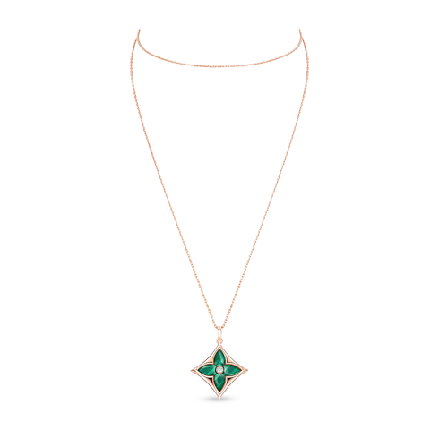 Color Blossom celebrates the Monogram Flower created in 1896 by Georges Vuitton. Set into 18-karat pink gold, the pendant's petals are carved from malachite. Perfect for layering, the medallion can be worn at three different lengths. Its bold size complements other pieces from the Color Blossom Collection.