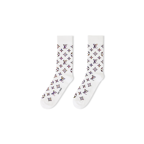 With a playfult twist on the Monogram, these colourful socks stand out through their vibrant palette and lightweight cotton-blend feel. The House Monogram is rendered in a combination of dynamic hues, from yellow to purple, repeated from calf to toe. These socks are signed with a Louis Vuitton logo under each foot.