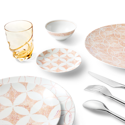 The graphic, eye-pleasing design of this set of two presentation plates was inspired by a Louis Vuitton icon: the Monogram Flower and Diamond motif. Meticulously rendered in fine porcelain, the intricate Constellation pattern provides an enhancing backdrop for any culinary creation. The perfect accompaniment to the other pieces in the collection, these plates make every meal a special occasion.
