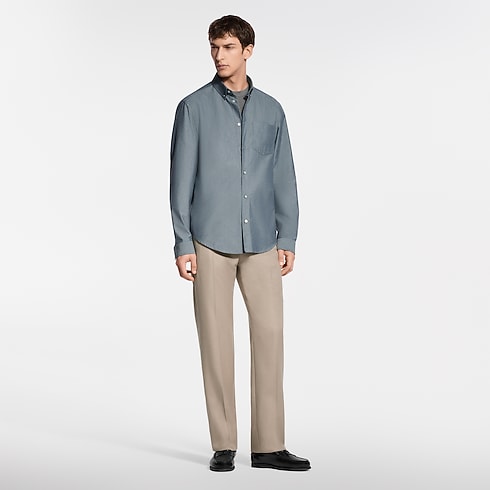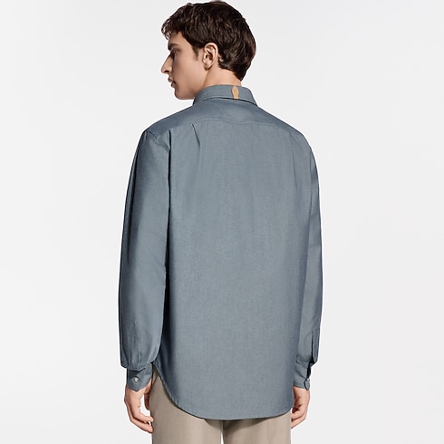 This long-sleeved cotton-silk chambray shirt offers comfort and breathability with a smooth and lustrous finish. LV stitching signs the top button, while a VVN leather tab behind the collar nods to the House’s travel heritage. The beautifully draped fabric and casual style with a buttoned-down collar lend a contemporary accent to spring and summer looks.