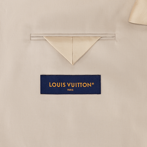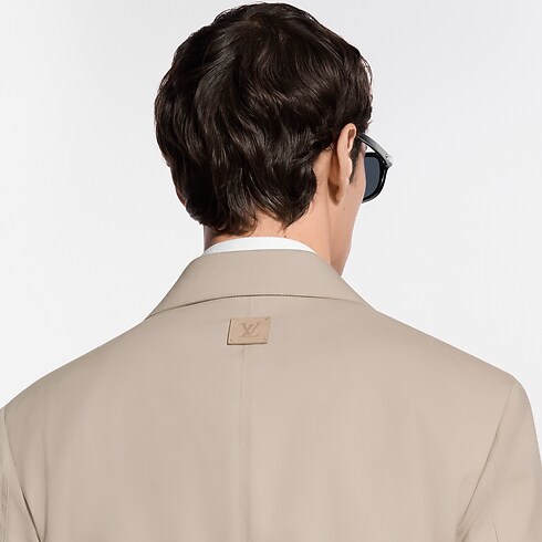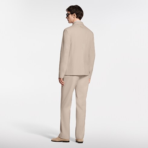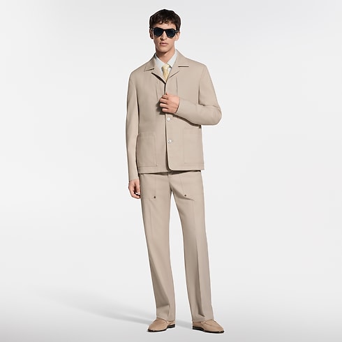 This minimalist beige workwear jacket makes an elegant modern addition to the formal wardrobe. It is tailored from a smooth cotton-silk canvas that is light and breathable for summer. A tone-on-tone triangular leather patch adorns the left chest, crafted with a Damier motif and embellished with a metal LV ornament. Matching trousers make an effortless set.