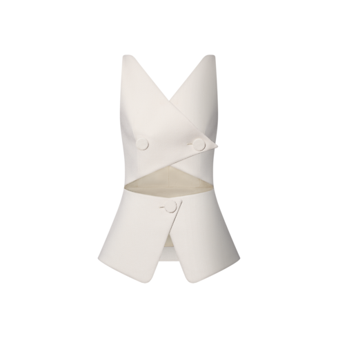 This top has a sophisticated contemporary air in a graphic silhouette. It is tailored from wool crepe in a fitted cut that echoes the look of a double-breasted waistcoat with oversized buttons, while a diamond-shaped cut-out adds a playful reveal to the middle. The back is finished with slim straps for a chic play of structure.