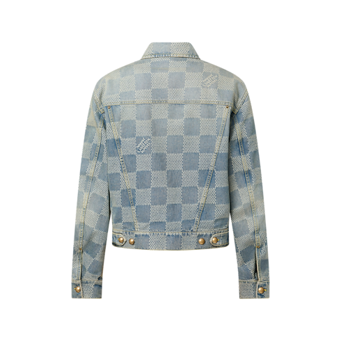 The classic silhouette of this denim jacket is distinguished with a 3D Damier jacquard incorporating Marque L.Vuitton Déposée signatures with a softly textured effect. Crafted in washed indigo denim, it has yellow topstitching with aged copper-toned components and domed buttons. A wardrobe essential that is easy to mix and match, it has matching jeans for a signature look.