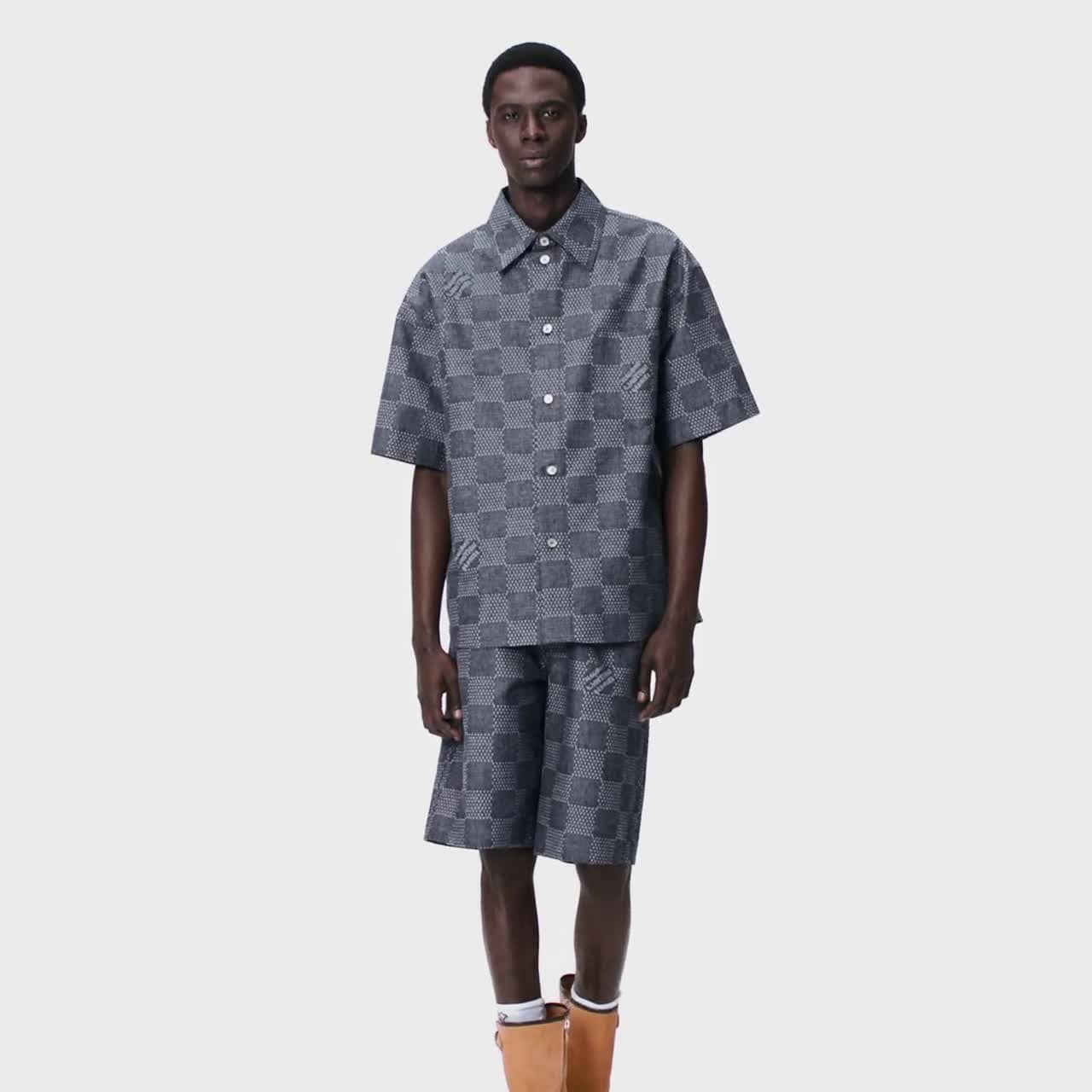 A wardrobe essential, these timeless cotton chambray shorts are crafted from a sophisticated Damier jacquard with a delicate seed motif creating a light mood. ‘Marque L.Vuitton déposée’ signatures are incorporated into the weave, while a pearl-effect button and rivets add a dandy twist. These shorts have a matching short-sleeved shirt for a fresh and summery clothing look.