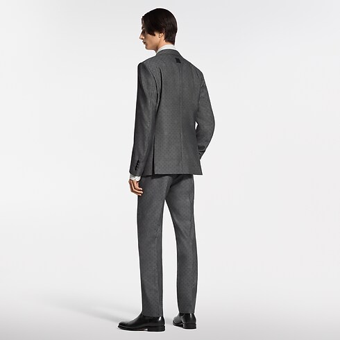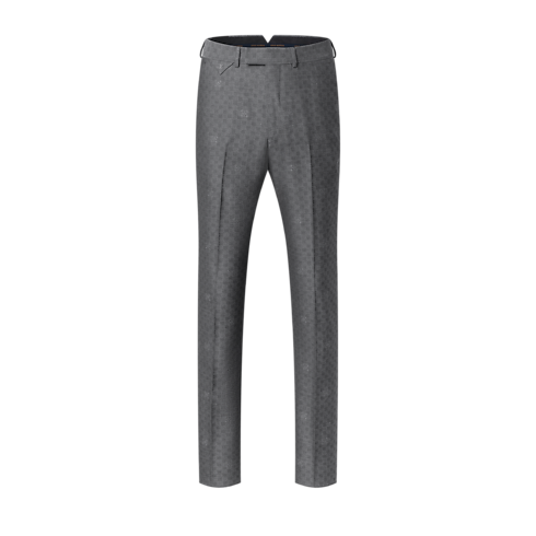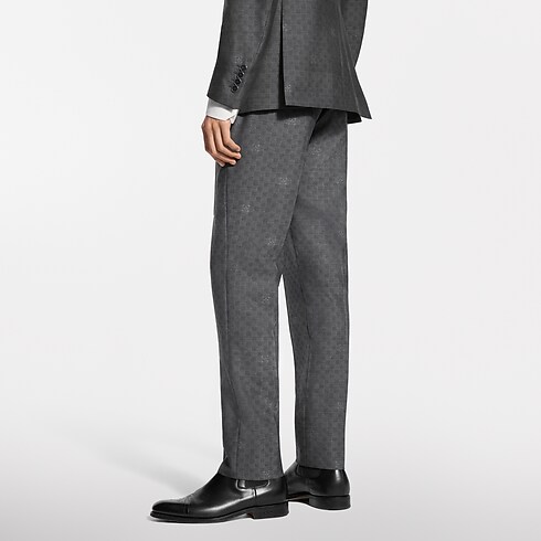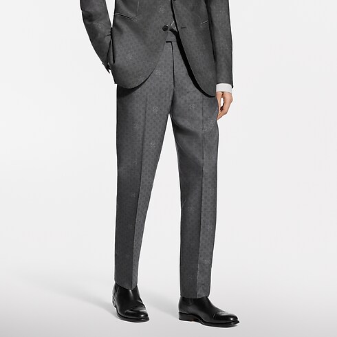 Elegantly tailored in a timeless dark grey, these flattering cigarette trousers are ideal for formal business occasions. The fine wool is woven into a tone-on-tone jacquard with a sophisticated Mini Damier Seeds motif. The pattern incorporates Monogram Flowers with a softly dappled effect, while a woven LV label signs the rear waist. A matching jacket makes a poised and streamlined suit.