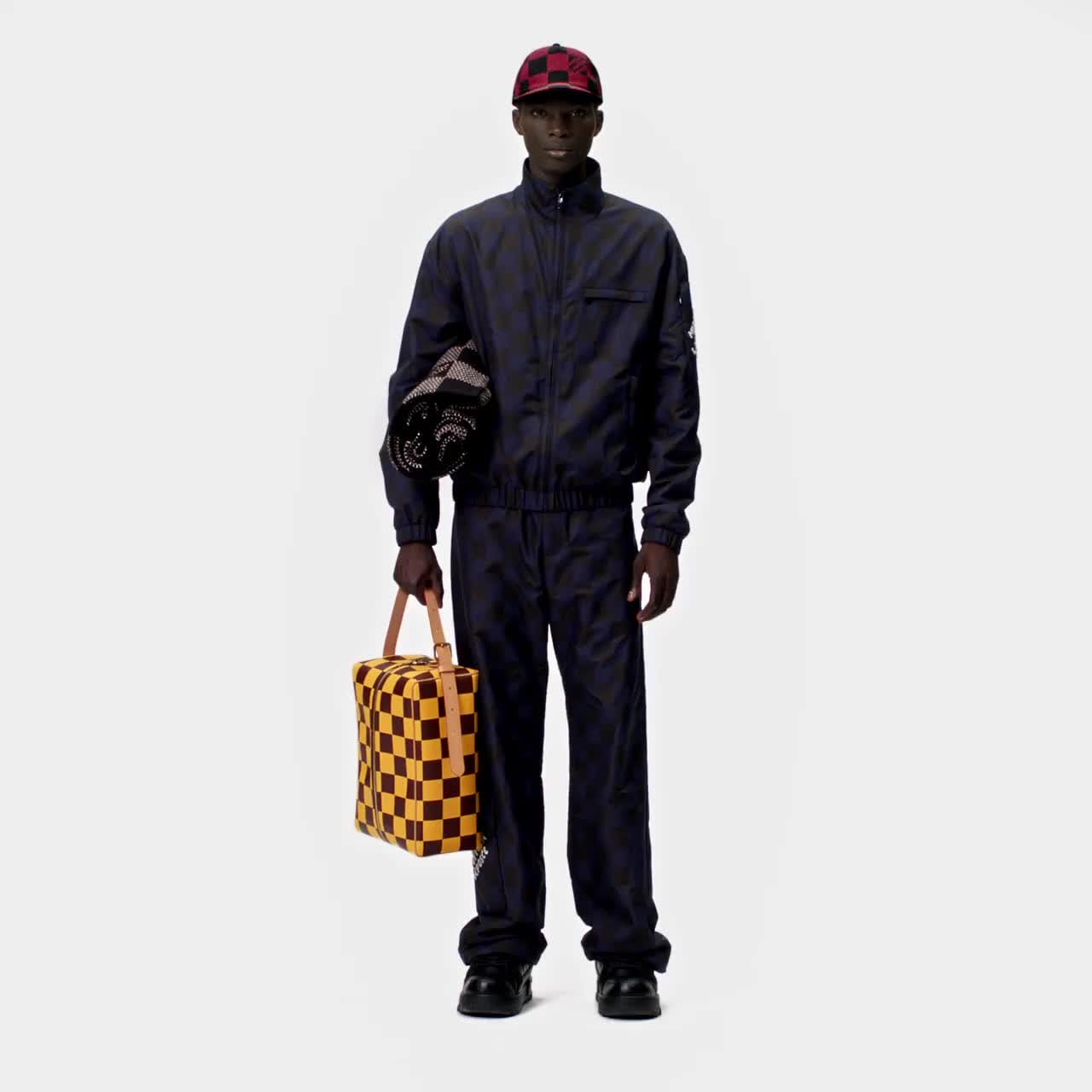 Crafted from a light, technical fabric, these trousers are the perfect travelling companion. They are distinguished with the Spring-Summer 2024 Show’s graphic Damier Pop motif and signed with a jewel-like ‘Marque L. Vuitton déposée’, embroidered with crystals on a patch pocket on the right leg. This trendy piece of clothing has a matching track top for a bold yet comfortable total look.