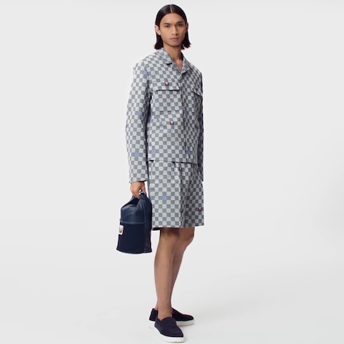 This graphic overshirt features a Damier motif inspired by the Louis Vuitton 37th America’s Cup capsule. Tailored from a sophisticated cotton fil coupé jacquard in pale grey and black tones, it is accented with colourful Gaston and micro Damier signatures, while an embroidered Gaston patch at the back lends a sporty vibe. Matching tailored shorts make an elegant summer clothing set.