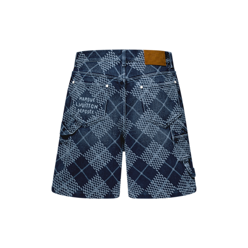 These graphic Denim Carpenter Shorts offer a modern twist on a traditional Argyle pattern, with a bleached-effect all-over Damier Argyle design incorporating the iconic House motif. Details include carpenter chaps and hammer holders, while Marque L.Vuitton Deposée signatures complete this on-trend design, which has a matching blouson for a total look.