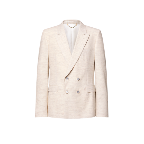 This chic double-breasted jacket draws on the refined textures and tonalities of the Spring-Summer 2026 Show’s Indian inspiration. The sharp silhouette is tailored from pale beige wool-cotton with a subtle grained and flecked weave inspired by India’s naturally dyed yarns. A leather signature patch accents the left sleeve. Matching flared trousers make a sharp suit for spring.
