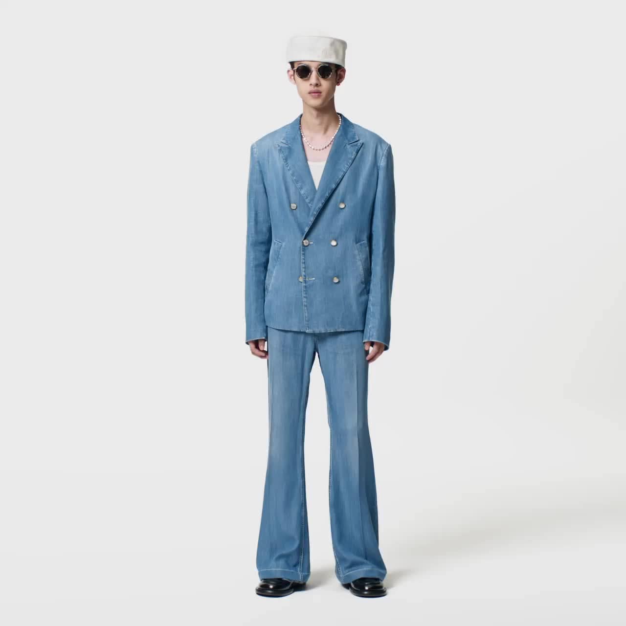 This double-breasted jacket inspired by this collection’s nautical theme is perfect for a Riviera promenade. Offering a contemporary take on tailoring with its fluid drape, it is crafted from a soft washed chambray adorned with pearl-effect buttons for a sophisticated dandy twist. This jacket can be worn as a suit with flared trousers for a laid-back yet elegant silhouette.