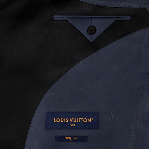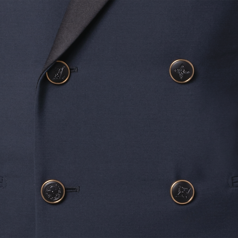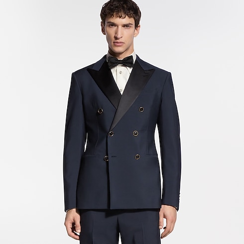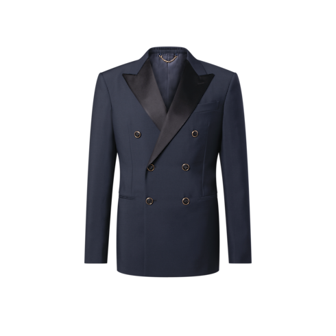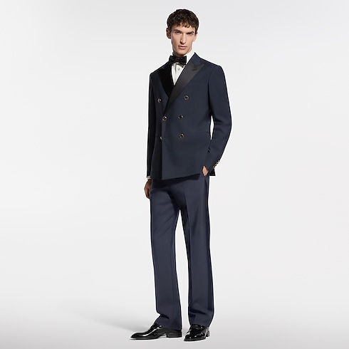 This sharply tailored tuxedo jacket is cut from elegant navy blue grain de poudre wool with a black satin peak lapel. Signature buttons with rhinestone accents in golden metal settings adorn the front, while a woven LV label discreetly signs the back. Matching trousers make a poised and timeless evening set.