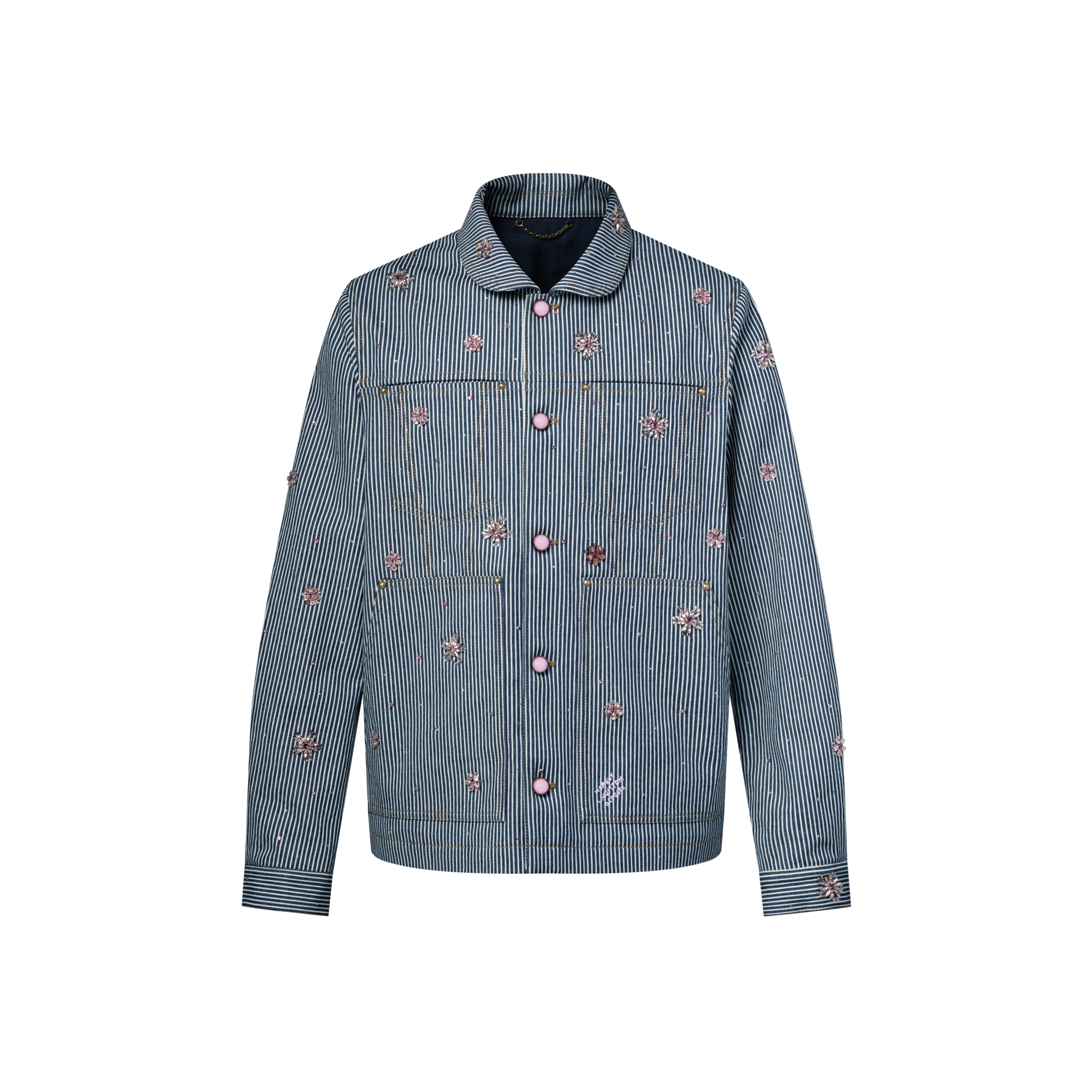 These washed denim shorts from the Fall-Winter 2025 Show are inspired by this collection’s collaboration with the Japanese designer, Nigo. They are elevated with a hand-embroidered jewel-like cherry blossom rhinestone motif and signed with Marque L.Vuitton Déposée embroidery and a Mini Damier leather jacqueron. A matching denim trucker makes a sophisticated urban set.