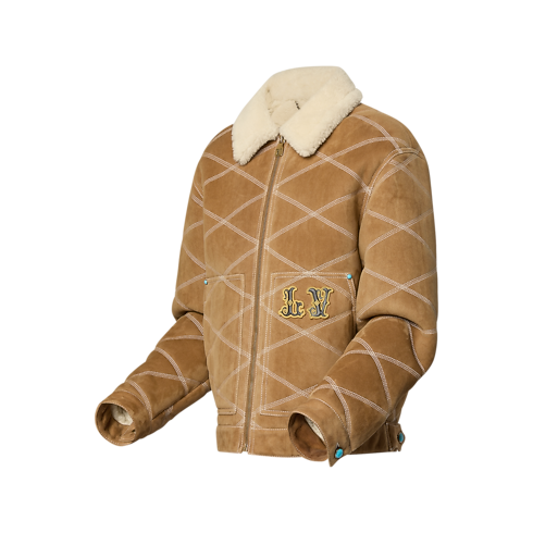 The casual silhouette of this shearling blouson contrasts with the meticulous craftsmanship involved in its construction. A topstitched all-over diamond motif nods to the interiors of the House’s heritage trunks, while the Fall-Winter 2024 Show’s Far West theme is amplified in vintage-inspired padded and embroidered leather LV and Louis Vuitton patches that adorn the front and back. Turquoise blue buttons and rivets add a sophisticated final twist.