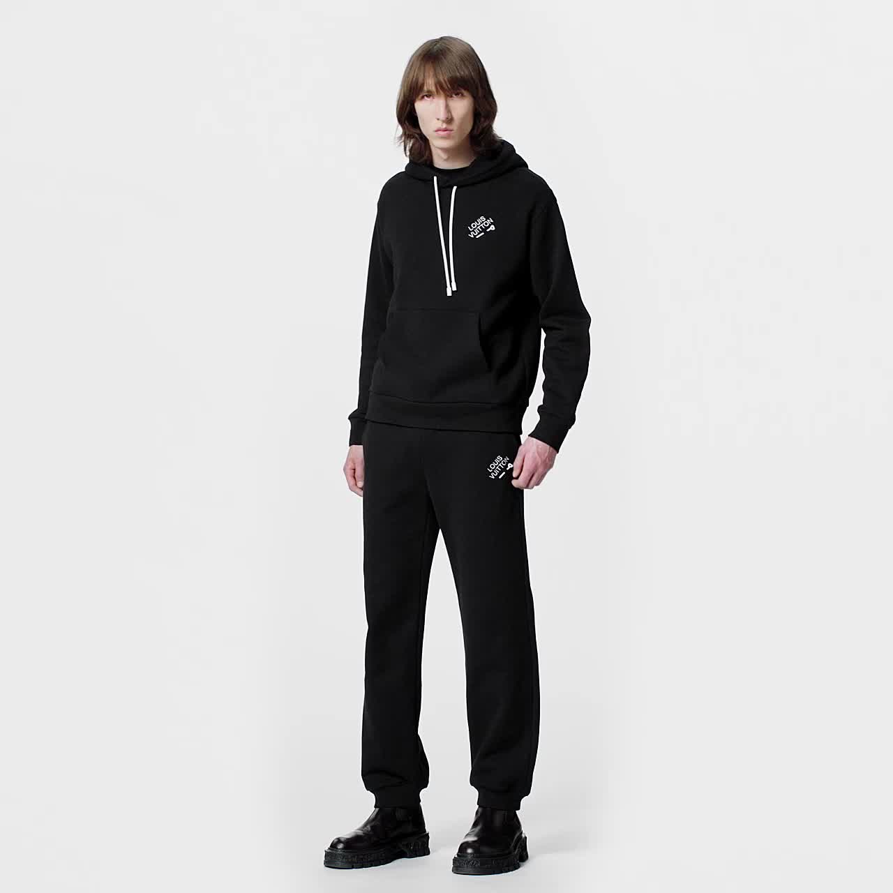 This smart hoodie is made from brushed back cotton felpa and has a lined hood, kangaroo pocket and a ribbed bottom hem and cuffs. It features one of this season’s iconic colours, set off by contrasting white cords and an embroidered white Louis Vuitton signature on the chest, underlined by a matching staple pin.