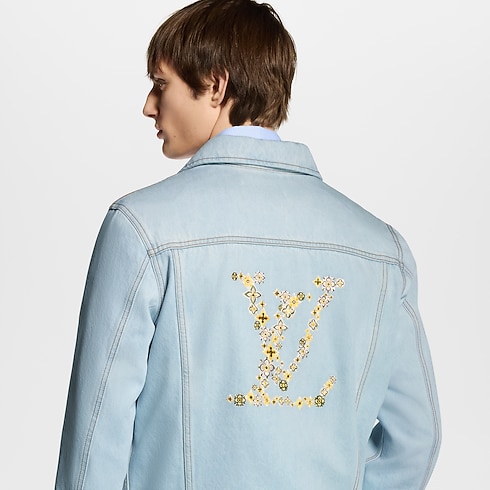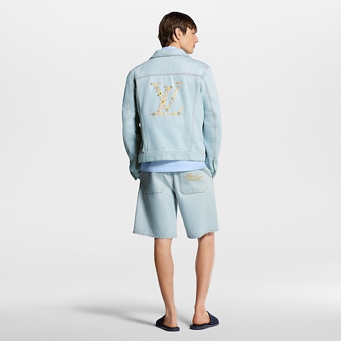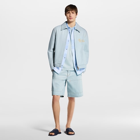 This casual and elegant workwear blouson is crafted in pale, washed organic denim. Gold-toned cursive Louis Vuitton embroidery lends a delicate accent to the left chest, while romantic floral LV Blooming embroidery on the back showcases the House’s savoir-faire. Details include tobacco-toned topstitching and a cheerful gingham lining. Matching shorts make a summery set.