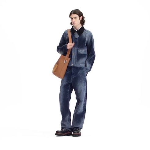 This dark blue trucker jacket is meticulously crafted from velvety flocked denim which has been overdyed and given a wax treatment for a rich vintage patina. It has a corduroy collar inspired by British outdoor tailoring and two utilitarian flap pockets signed with a stamped Monogram motif. Pair with matching trousers for a rugged twist on an urban silhouette.
