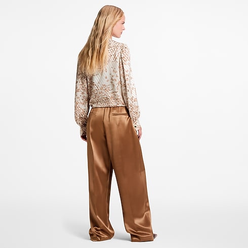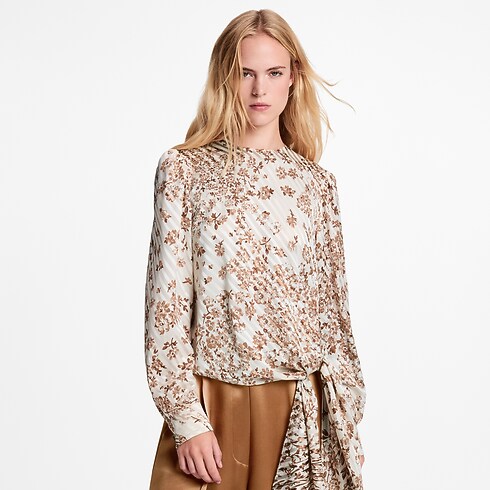 This blouse has a chic, modern look in airy silk twill featuring a romantic jacquard of stripes and flowers. The long sleeves are gathered around the shoulders to emphasise the fluidity, while the left hip is finished with a breezy knotted tie that gracefully drapes to the side. This piece of clothing fastens at the back with an elegant keyhole neckline.