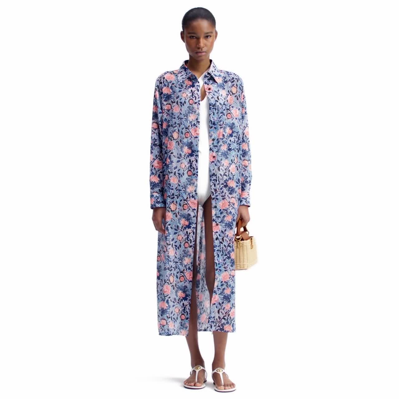 This shirt dress has a fresh, romantic spirit in lightweight cotton voile featuring an all-over print of this season’s signature floral vine motif. It is cut in a clean, full-length shape with long sleeves, a hidden button tab and a smart collar. A coordinating D-ring belt accentuates the waistline for a flattering silhouette.