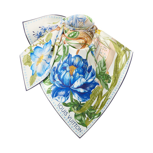 The all-silk Fontaines Parfumées square captures the essence of Louis Vuitton in an intricate design inspired by the art of fragrance. Its colourful pattern depicts a vintage-style perfume extractor surrounded by delicate flowers, with the House’s perfumery atelier in the background. This is an elegant feminine accessory, infused with the harmony of craftsmanship and nature.