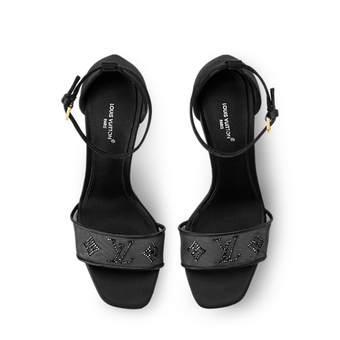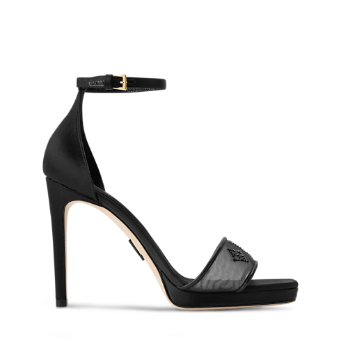 The Gala Platform Sandals are a sophisticated style with front straps in translucent mesh, on which glittering Swarovski™ rhinestones recreate the Louis Vuitton Monogram pattern. Slender ankle straps, adjusted with tiny buckles, add to the elegance of this design, which balances a high stiletto heel with a small platform.