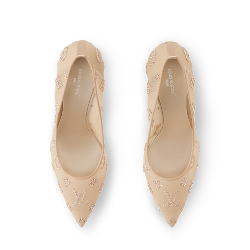 The Gala Pumps are reimagined this season in mesh embroidered with rhinestones forming the Louis Vuitton Monogram pattern. This sophisticated, evening-ready style is characterised by its pointed toe and high stiletto heel. It is finished with a leather outsole, which is discreetly signed with an LV Initials accessory in gold-toned metal.