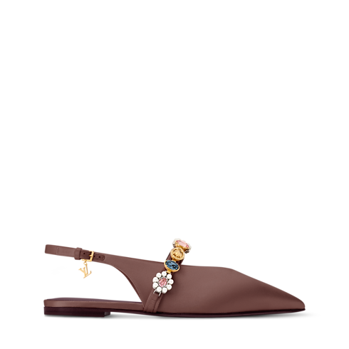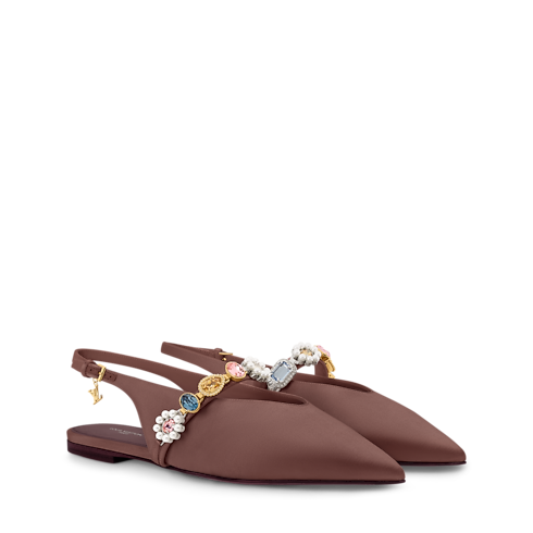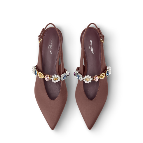 The Gala Slingback Ballerinas combine ease of wear with elegance and sophistication. The satin uppers, notable for their feminine pointed toes, are embellished with a row of jewel-like accessories inspired by family heirlooms. The back straps are adjusted with tiny buckles bearing gold-colour LV Initials charms.