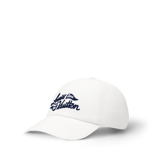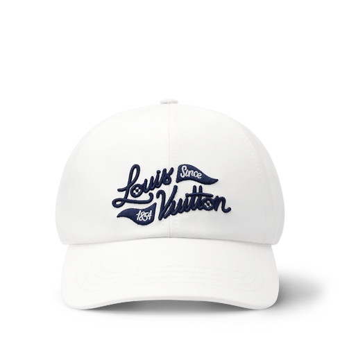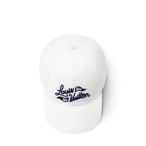 The bright white Golf Cap freshens up a day on the green. The signature, 'Louis Vuitton Since 1854,' is embroidered in an elegant script alongside triangle golf flags on the front panel in an intense blue. The back strap is equipped with a square buckle engraved with LOUIS VUITTON for customisable comfort and elegance.