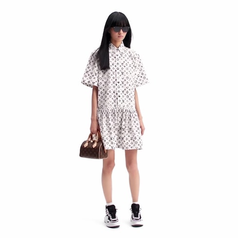 This shirt dress has a bold, summery spirit in cotton poplin featuring a graphic all-over print of this season’s Pop Art-inspired Monogram motif. The top half has a classic tailored look with short sleeves, a smart collar and a button front, while the skirt is gathered around the hips to add breezy volume to the silhouette.