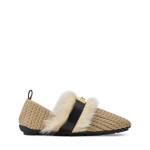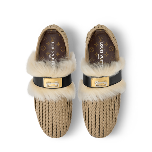 The Haven Flat Closed Mules come in braided calf leather with fluffy shearling trims. Designed by Women's Artistic Director Nicolas Ghesquière for the Spring-Summer 2026 Show, they combine comfort with the fine craftsmanship of leather braids on a supple mesh base. They are accessorised with gold-toned Swing Locks, referencing the House's historic trunks.