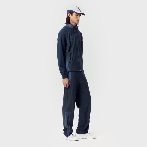 This navy hooded blouson, conceived for the Louis Vuitton 37th America’s Cup, contrasts soft cotton sleeves with knitted cuffs and a technical stretch jersey body. Adorned with LV Cup signatures front and back, it features taped waterproof zips, an adjustable hood and vents for breathability. Matching trousers make a chic set.