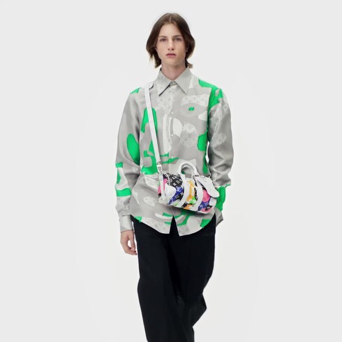 This Keepall Bandoulière 25 bag is part of the LV Portrait capsule. The combination of leather patches and a print, which at first glance seems to be random forms, creates the image of a face with an eye staring outward. It features a leather and canvas Monogram charm.