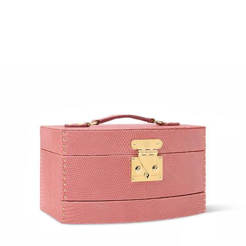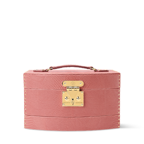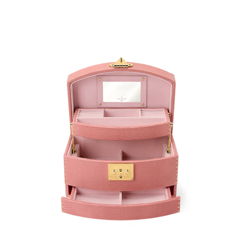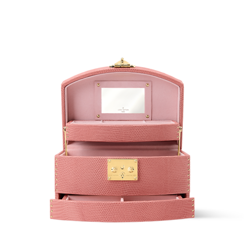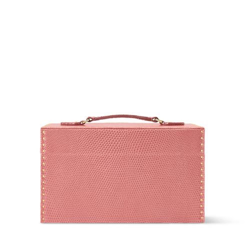 Inspired by the opulent boudoirs of Anne of Austria, the Vanity Cheri case, crafted from precious lizard leather with discreet rivets along the sides, comes in a delicate salmon hue with matching lining. The smooth sliding system opens the three drawers simultaneously, giving instant access. Roomy yet light, it is easy to carry thanks to its compact size and top handle.