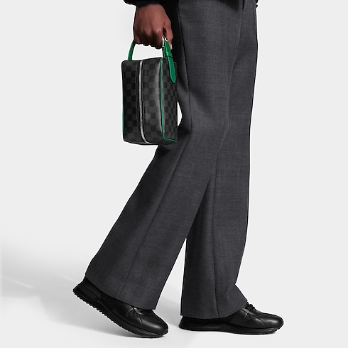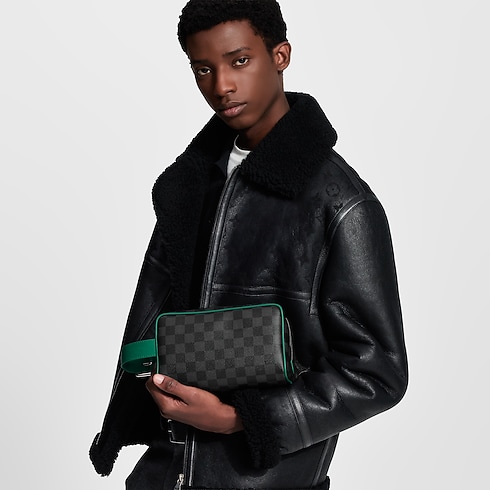 This Locket Dopp Kit toiletry pouch is crafted from Damier Graphite coated canvas and features a dark green leather handle with a silver-colour buckle. Compact but spacious enough to hold all the essentials, its practical design includes a zipped inside pocket and a washable lining, as well as a comfortable adjustable side handle for added convenience.