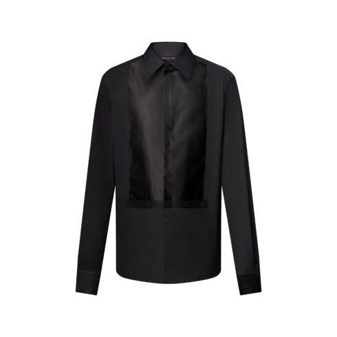 This elegant evening shirt brings a contemporary twist to a classic style. It is cut from black cotton poplin and features a satin bib front and cuffs. A jacquard band with Monogram elements accents the front, while woven labels sign the placket and the back. This piece of clothing can be styled under a tuxedo as part of a chic evening ensemble.