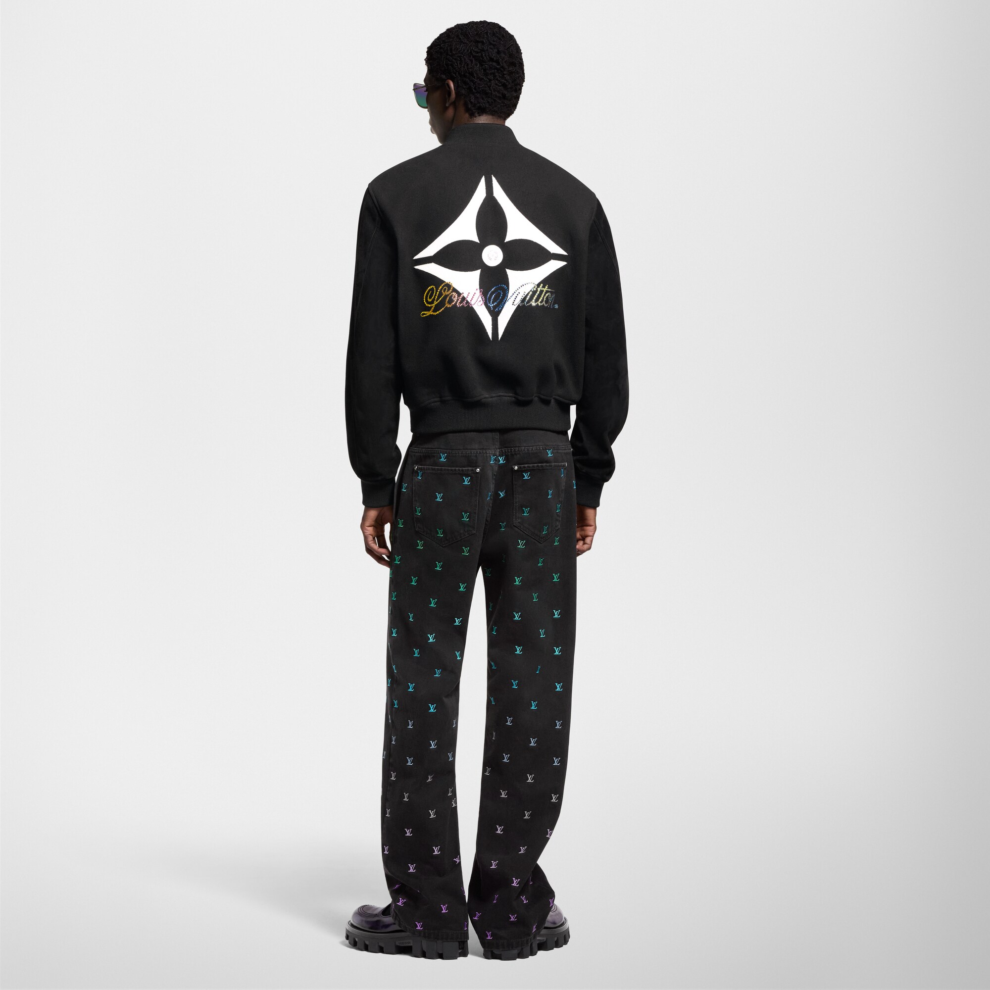 Crafted from washed black denim, these relaxed skate trousers are adorned with an embroidered all-over LV Blason motif in this Spring Collection’s sophisticated gradient theme, with pop colours fading from aqua to shades of green, blue and violet. This is an eye-catching casual style that brings a dynamic signature accent to a look.