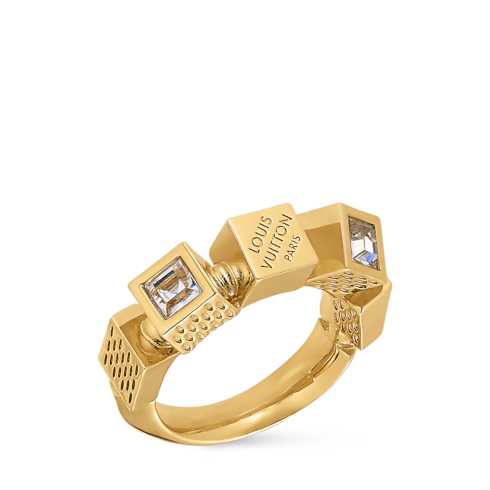 The eye-catching angular forms of the LV Cube Ring were inspired by Pateki, a puzzle game invented by Gaston Vuitton in 1932. Its gold-coloured metal band holds an array of cubes reminiscent of the historic Damier canvas, engraved with delicate stripes and the Louis Vuitton Paris signature. Resplendent rhinestones add a glamorous touch of sparkle to this enchanting ring.
