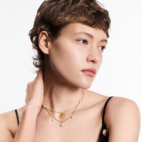 The LV Floragram Necklace's double-row style allows two iconic House symbols to shine in one delicate design. The top strand features an LV Initials charm, while a series of Monogram Flowers with pearl-effect resin bead petals decorate the second strand. The combination of different materials creates a three-dimensional effect that highlights the piece's craftsmanship.