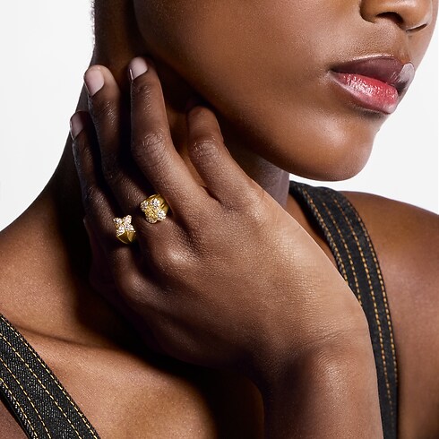 With its imaginative design and superb craftsmanship, the LV Flower Comet Ring makes a striking contemporary-chic statement. The geometric precision of its gold-colour open band contrasts with the delicate curves of Monogram Flowers at either end, paved with dazzling rhinestones. The LV Initials add an extra House touch to this sophisticated, eye-catching ring.